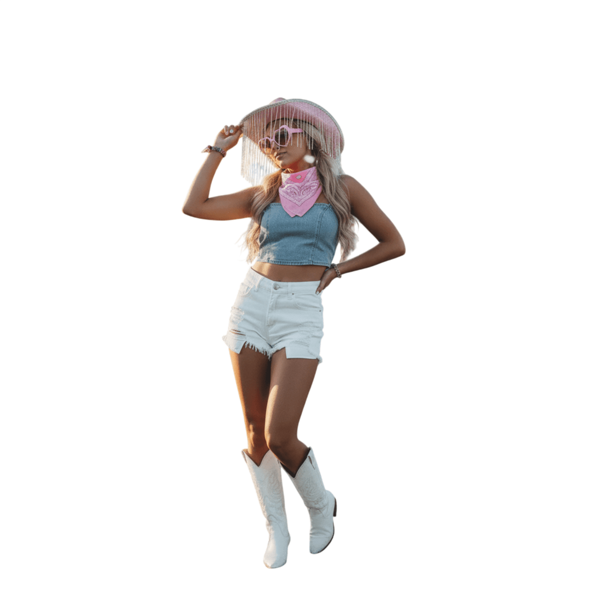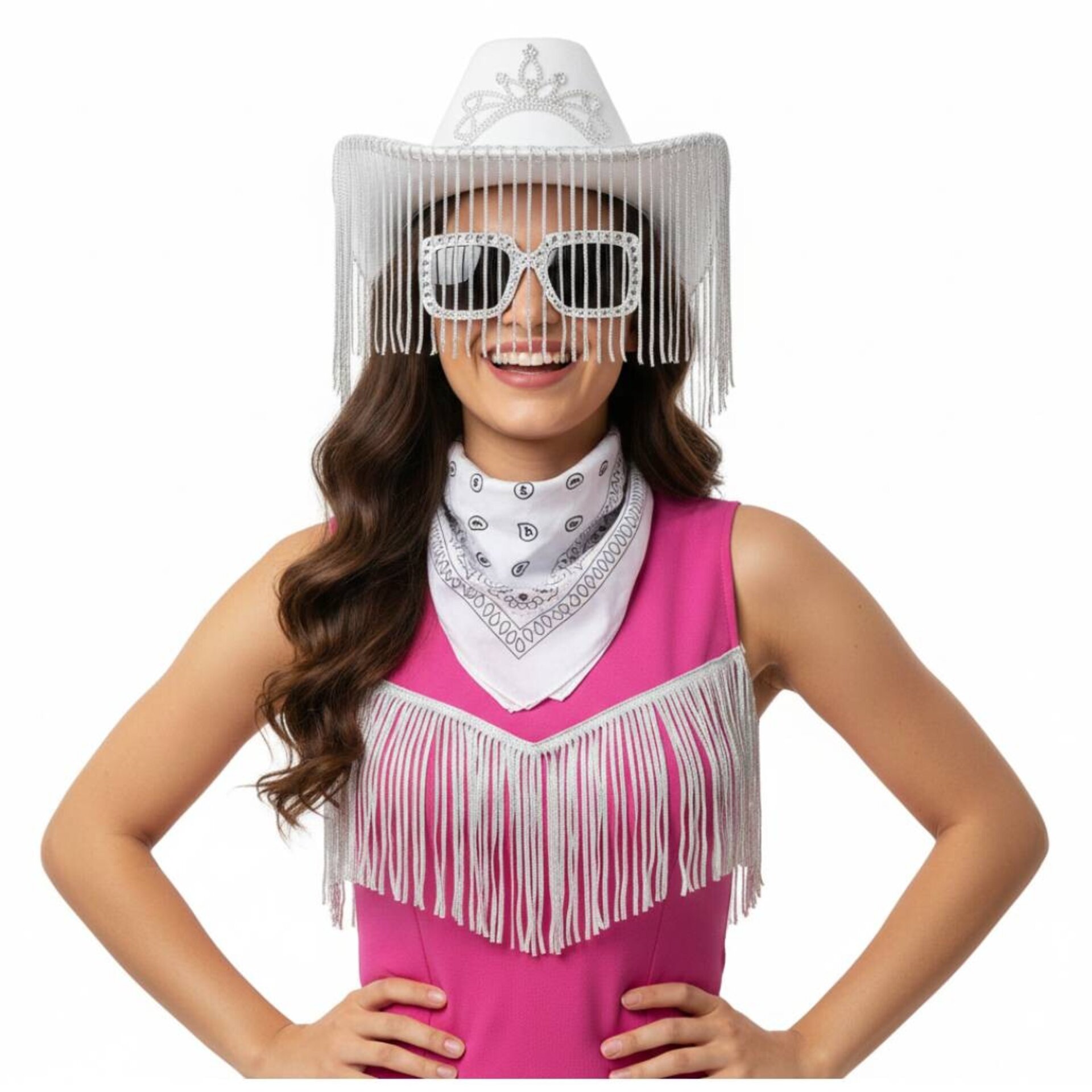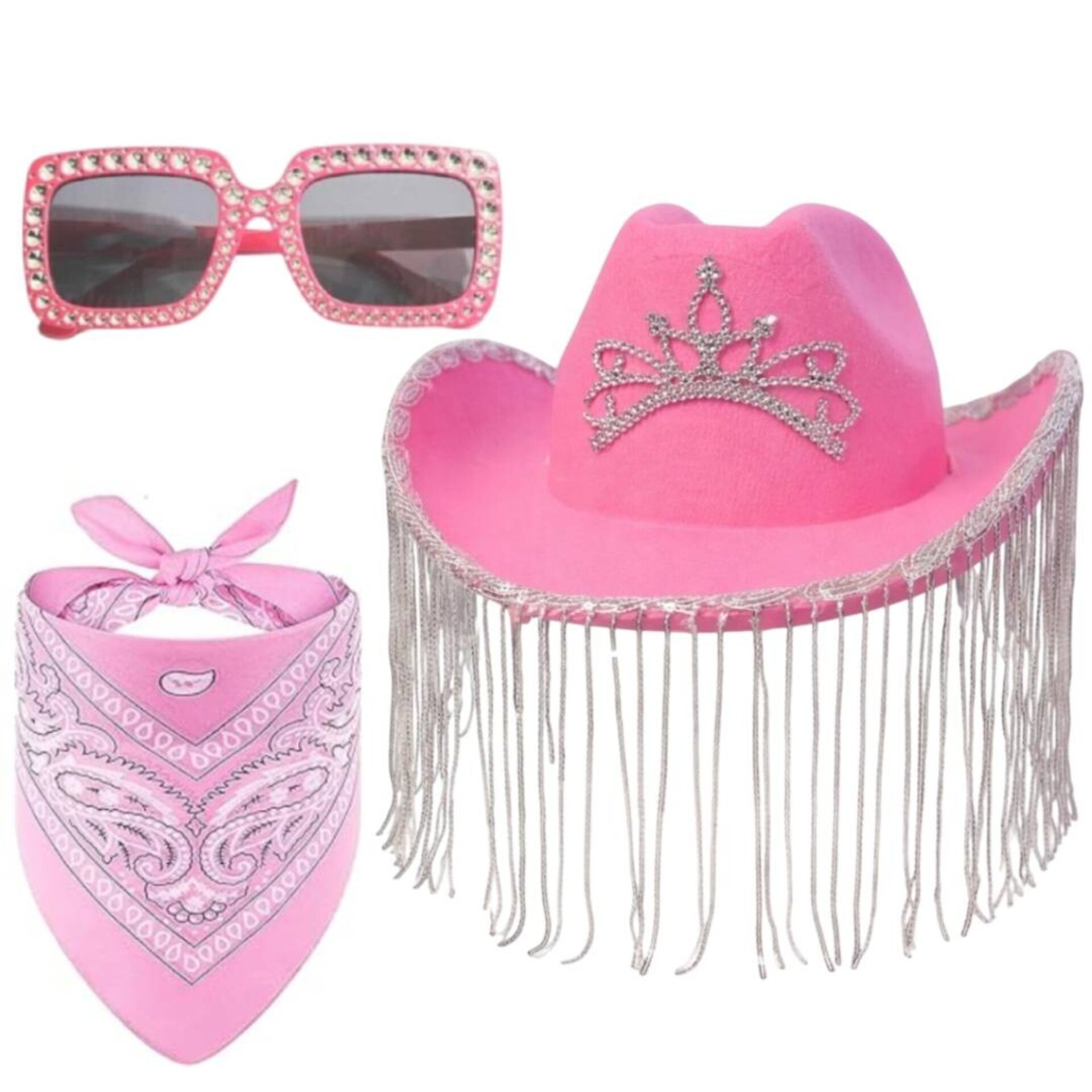 OfertaPack Disfraz Vaquera Rosa: Sombrero Cowgirl con Flecos Brillantes Gafas Bandana16,99 €29,99 €−43%
